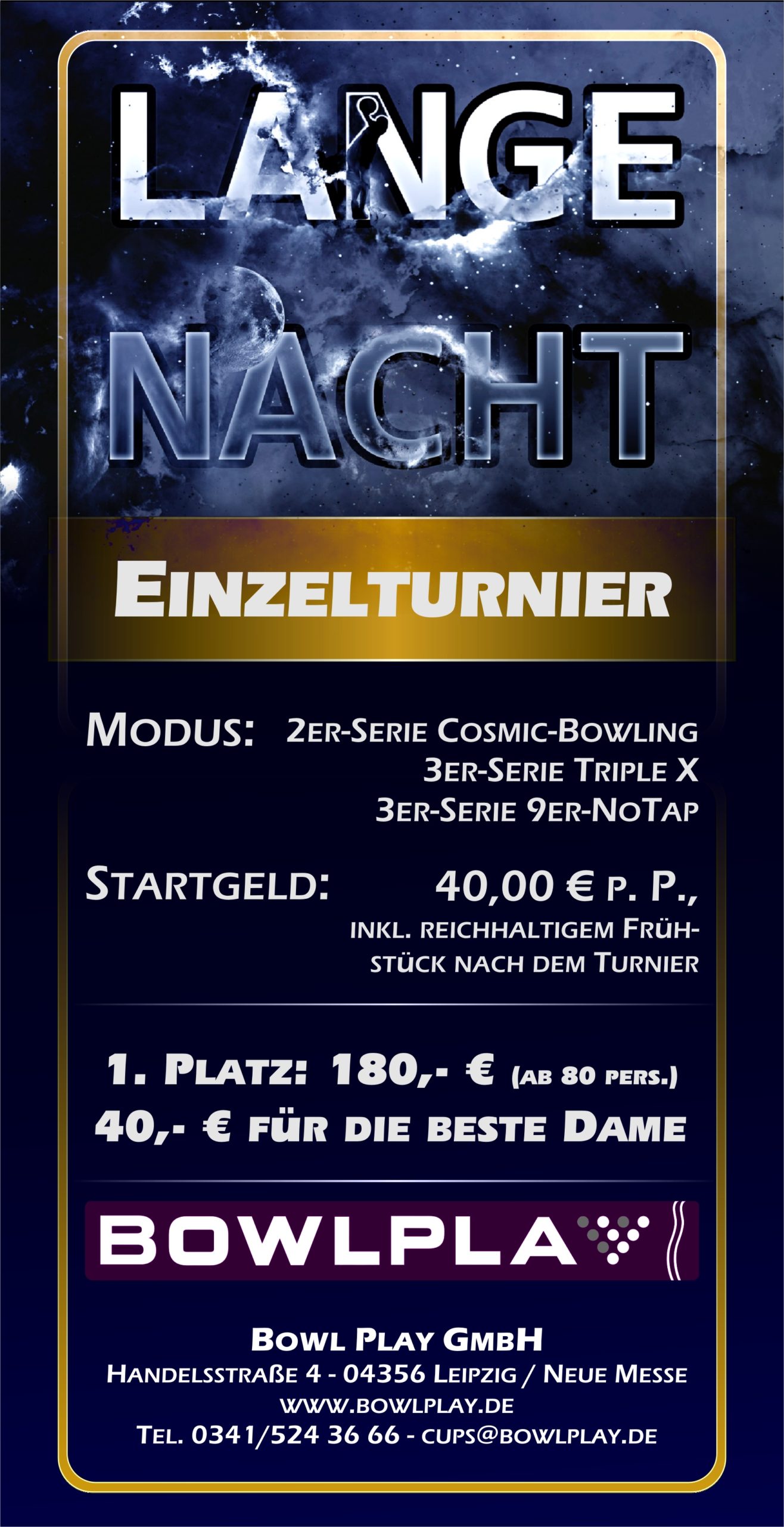 Jeder Spieler absolviert 2 Spiele unter Cosmic Licht, eine 3er Serie Triple XXX Modus, wobei nur das 4. errechnete Spiel in die Wertung geht und 3 Spiele im 9er No Tap Modus. Der Spieler m/w der am Ende das höchste Gesamtergebnis (Bruttopins) erzielt, gewinnt das Turnier.